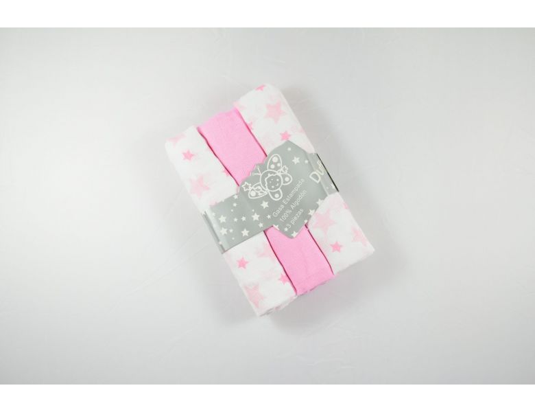 Muselinas de tamaño 80x80 cm. Pack de 3 muselinas. Muselina estampada 100% algodón. Dos muselinas estampadas y una lisa de color rosa. Dibujo de estrellas. Marca Duffi.