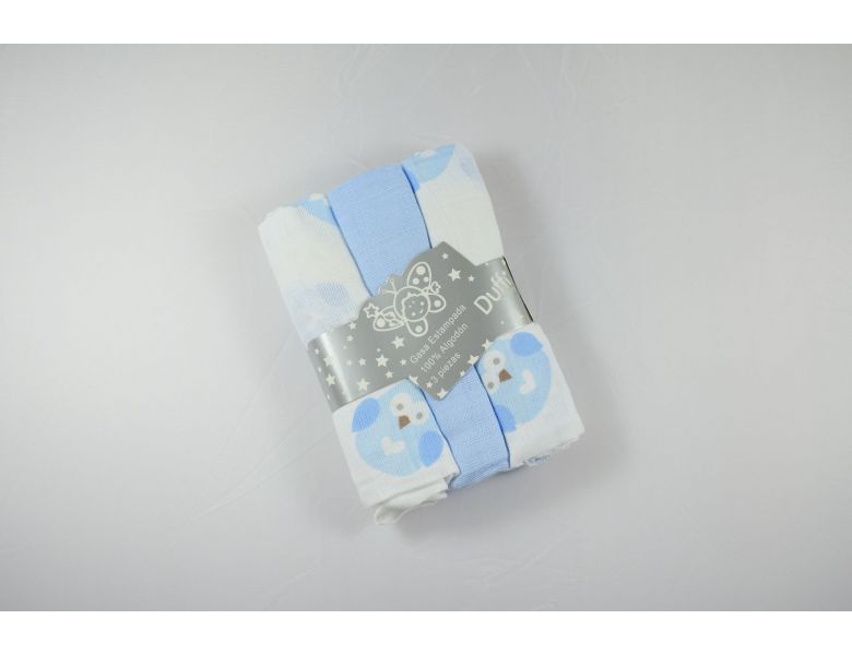 Muselinas de tamaño 80x80 cm. Pack de 3 muselinas. Muselina estampada 100% algodón. Dos muselinas estampadas y una lisa de color azul. Dibujo de estrellas. Marca Duffi.