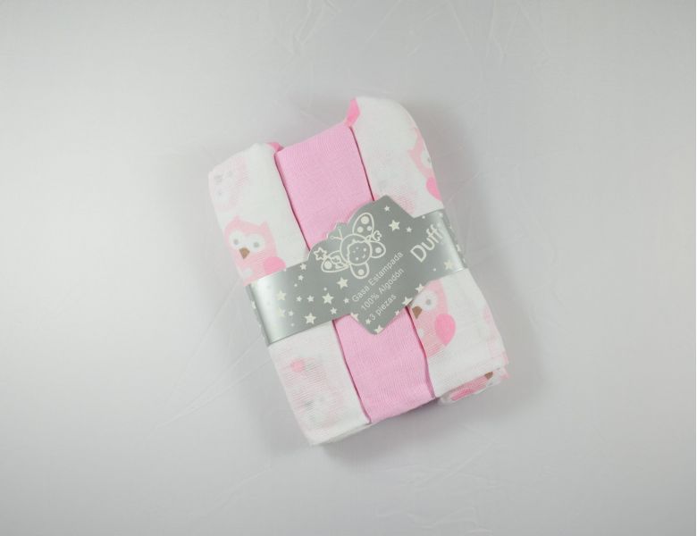 Muselinas de tamaño 80x80 cm. Pack de 3 muselinas. Muselina estampada 100% algodón. Dos muselinas estampadas y una lisa de color rosa. Dibujo de buhos. Marca Duffi.