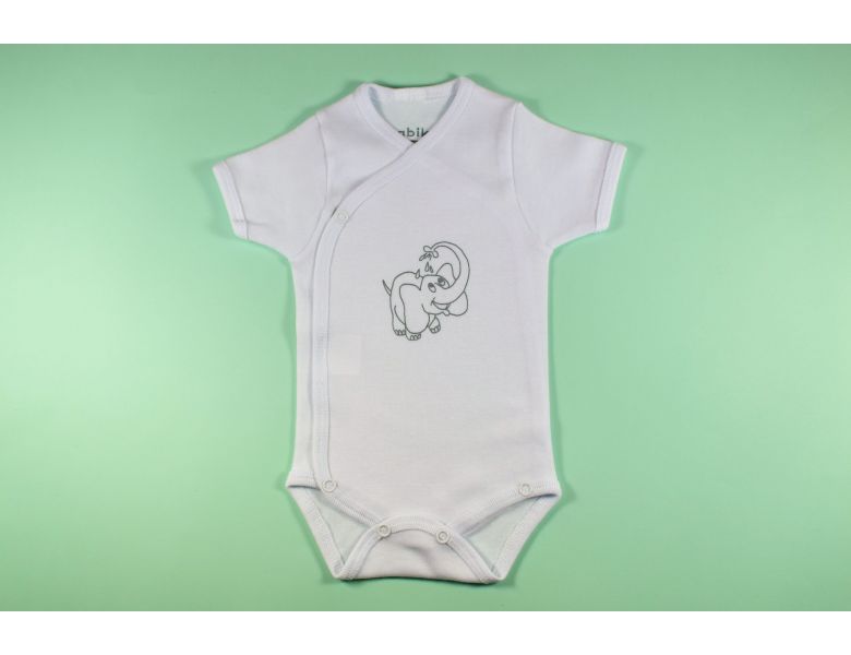 Body 5 broches de manga corta. 100% algodón. Color blanco con dibujo de un elefante. En la parte interior no lleva broche, así evitamos molestias innecesárias para el bebe. Marca BABIKÍ.