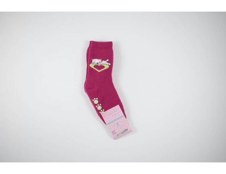 Calcetín antideslizante. Color granate con dibujo de un gatito. Composición: 70% algodón,28% poliester,2% elastano. Marca Twinday.