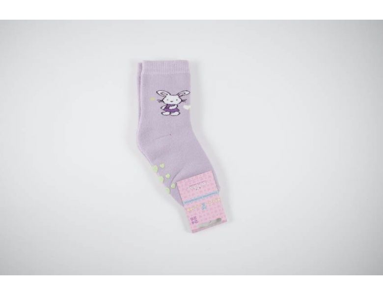Calcetín antideslizante. Color lila con dibujo de un conejito. Composición: 70% algodón,28% poliester,2% elastano. Marca Twinday.