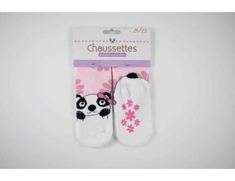 Calcetín antideslizante. Color rosa/rosa oscuro con dibujo de un oso panda. Composición: 70% algodón,28% poliester,2% elastano. Marca Twinday.