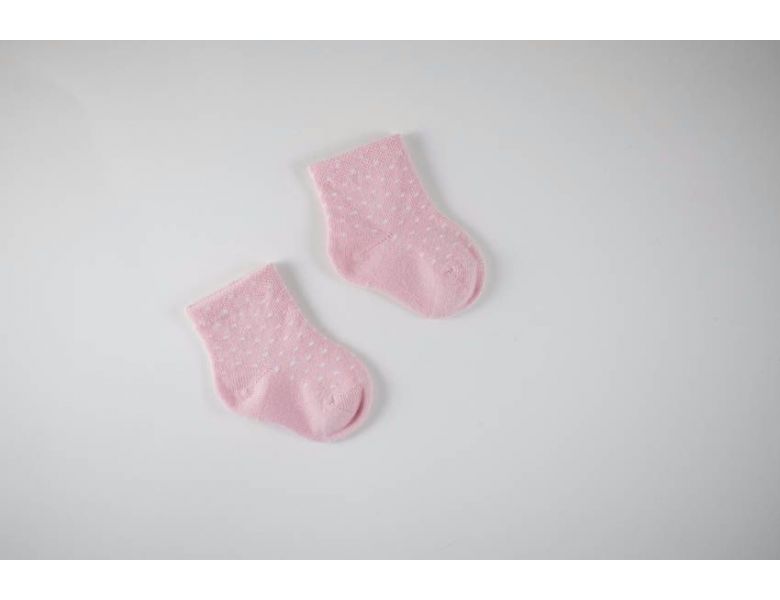 Calcetin bebe color rosa con topos blancos. Recién nacido. No aprieta. Muy suave. Composición: 40% modal,35 acrílico,22% poliamida,3% elastomero. Marca BABIKÍ