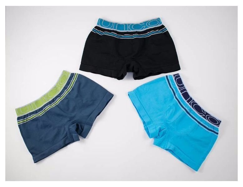Boxer 95% algodon y 5% elastano. Pack de 3 unidades (verde,marino y azul claro) en liso. Marca Unco.