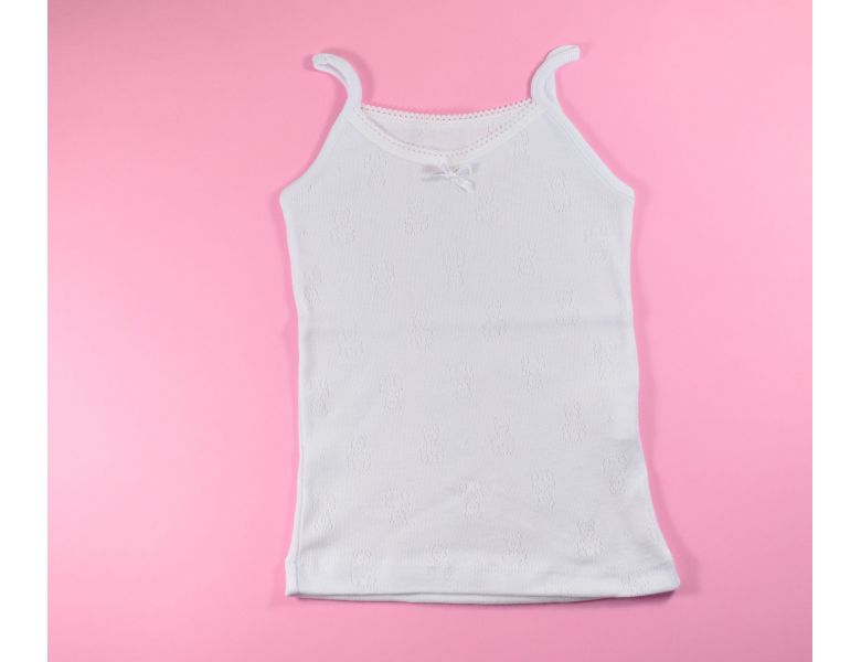 Camiseta interior con unos ositos calados de tirantes muy finos y un lazo de fantasía. 100% algodón. Marca BABIKÍ.