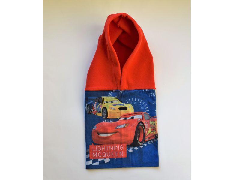Gorro con cuello de Cars, todo en una sola pieza. Muy práctico y confortable. La capucha en color azul y la parte del cuello con el dibujo de Cars. La capucha es forro polar y la parte del cuello es en tejido fino, pero doble tela. Marca Disney.
