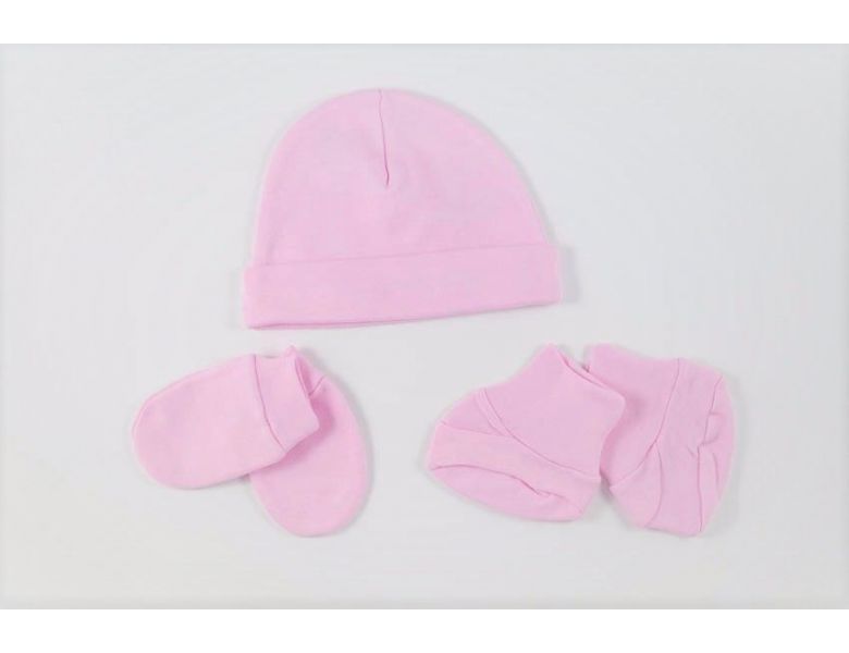 Conjunto de gorro,manoplas y patucos para recien nacido. 100% algodón. Color rosa. Marca BABIKÍ.