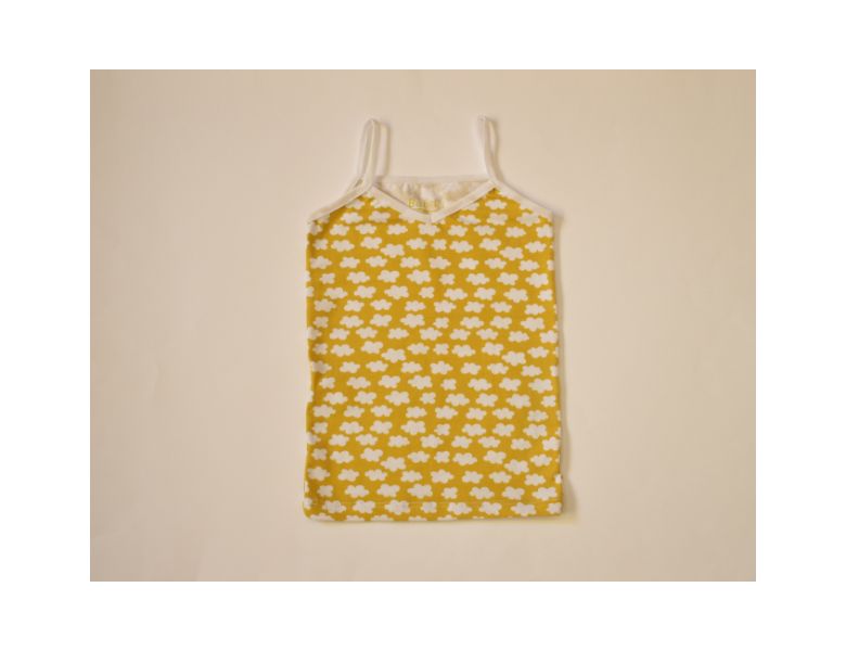 Camiseta interior estampada con dibujos de nubes blancas y fondo color mostaza con tirantes finos. 100% algodón. Lleva lacito de fantasía.