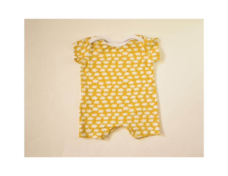 Pelele niña con manga corta. Pelele de una pieza con pantalón corto. Color mostaza de fondo y con dibujitos de nubes. 95% algodón y 5% elastáno.