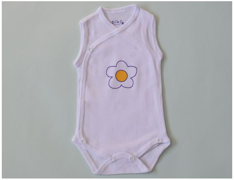 Body sin mangas calada con cuello de pico. Abertura por la parte delantera. 100% algodón. El defecto que tiene es que el tejido es calado, es decir, con dibujos y se ha añadido un dibujo en el centro. Tallas de 1,3,6 meses. Marca BABIKÍ.