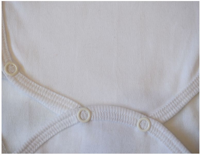 Body manga corta con cuello redondo y cierre con corchetes. Color blanco con dibujo de un trébol. 100% algodón. Talla 12 meses. Tiene 3 manchas muy pequeñas en la parte trasera inferior. Marca BABIKÍ.