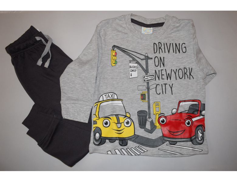Se compone básicamente del color gris claro, con coches de colores y pantalón de gris oscuro.