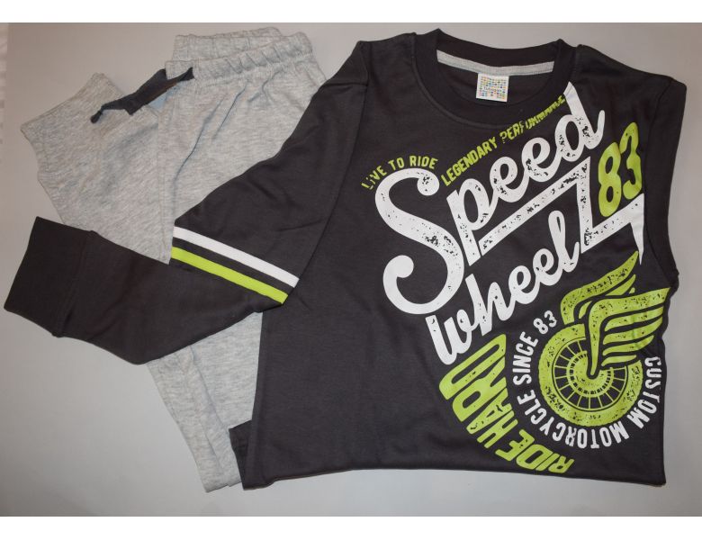 Básicamente se compone del color gris antracita con unas letras y pantalón gris claro.